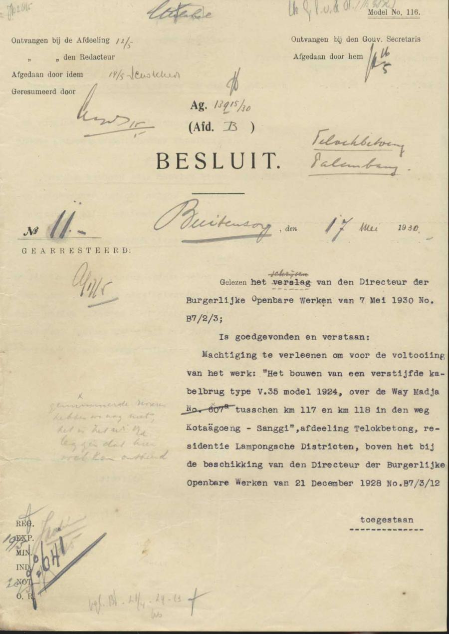 Besluit No 1 tentang Kabelbrug yang kaku tipe U 35 model 1924 melintasi Way Madja diantara KM 117dan 118 jalan Kota Agung-Sanggi Teluk Betung 8 April 1931 5
