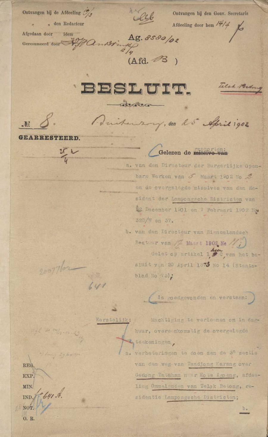Besluit No 8 tentang perbaikan untuk sectie III jalan dari Tandjung Karang melintasi Gedong Tataan ke Kota Agoeng afdeling Ommelanden Telok Betong Keresidenan Distrik Lampongsch 25 April 1902 1