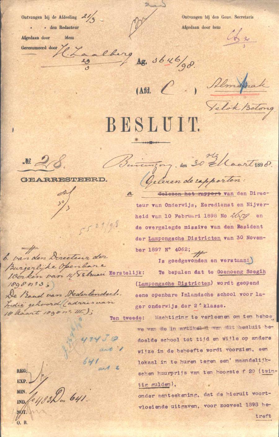 Besluit No.28 tentang Sekolah Umum Pribumi untuk kelas 2 di Goenoeng Soegih. 30 Maret 1898 1