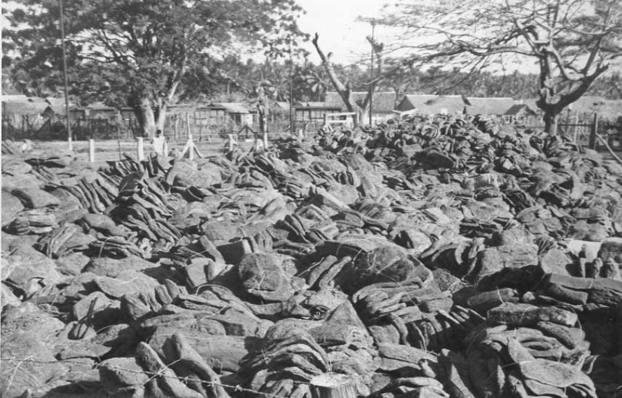Karet slab hasil usaha rakyat ditimbun di Pelabuhan Panjang untuk dieksport ke luar negeri. 24 Juni 1952