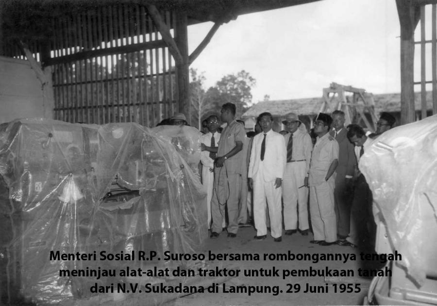Menteri Sosial R.P. Suroso bersama rombongannya tengah meninjau alat-alat dan traktor untuk pembukaan tanah dari N.V. Sukadana di Lampung. 29 Juni 1955