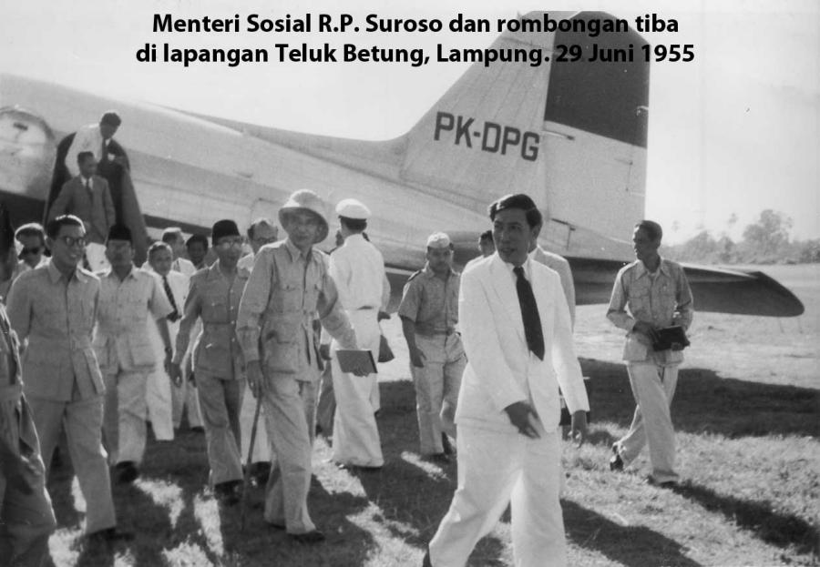 Menteri Sosial R.P. Suroso dan rombongan tiba di lapangan Teluk Betung, Lampung. 29 Juni 1955