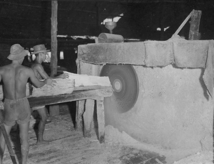 Pembikinan sagu aren di Selat Panjang Batang pohon aren sesudah dikupas kulitnya digiling dengan mesin menjadi bubuk 28 Juli 1951